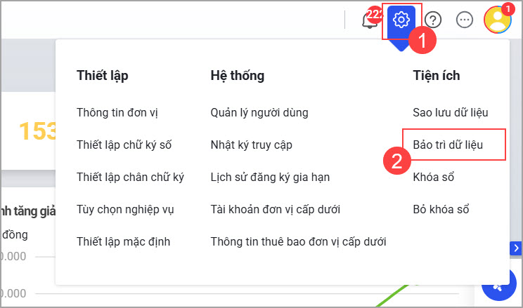 Nhấn vào biểu tượng Hệ thống tại góc trên bên phải màn hình, chọn Bảo trì dữ liệu.