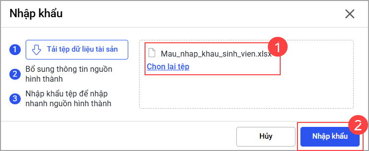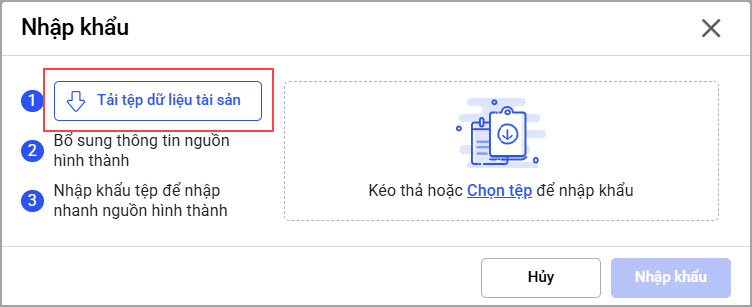 - Chọn Nguồn hình thành của tài sản trên file vừa tải.