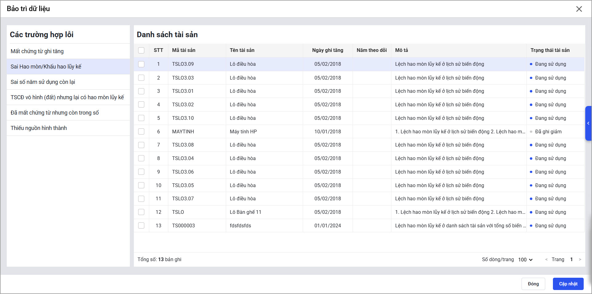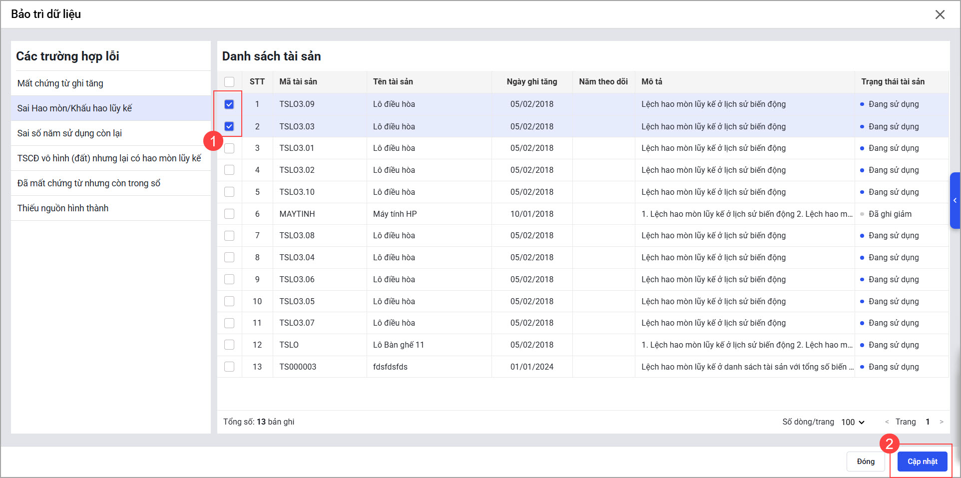 - Tích chọn tài sản, nhấn Cập nhật.