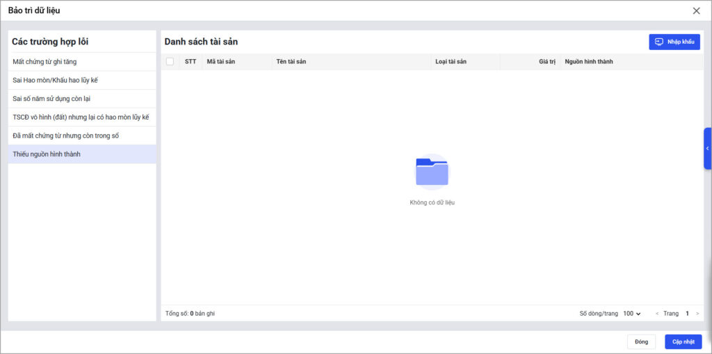 - Tại Bảo trì dữ liệu\Thiếu nguồn hình thành: Phần mềm hệ thống danh sách những tài sản thiếu Nguồn hình thành.