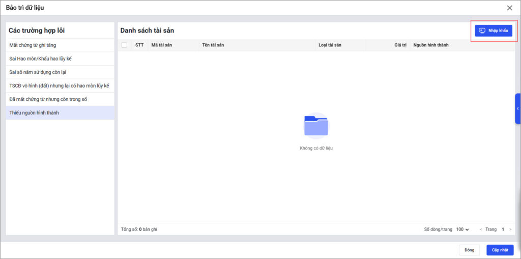- Chọn Tải tệp dữ liệu tài sản để tải danh sách tài sản thiếu nguồn hình thành trên phần mềm.