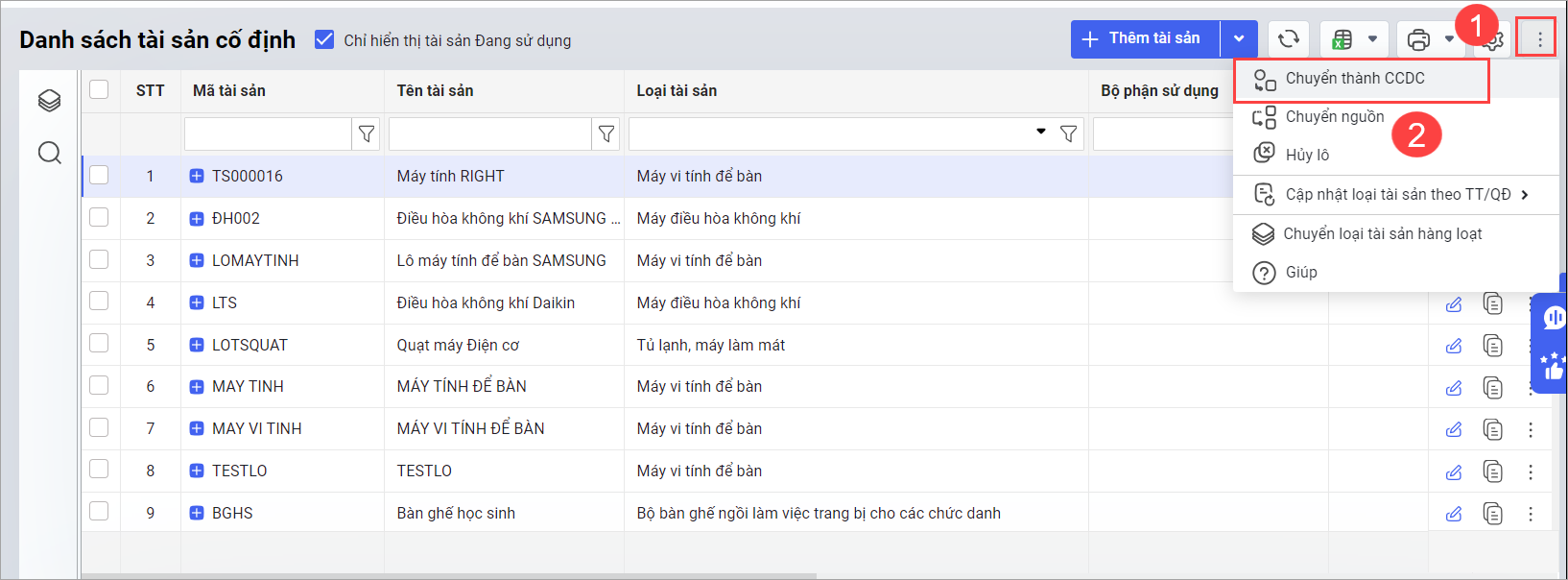 Bước 1: Vào menu Tài sản\Danh sách tài sản cố định, nhấn vào ⁝, chọn Chuyển thành CCDC.