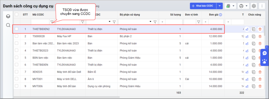 Bước 7: Tại Công cụ dụng\Danh sách Công cụ dụng cụ hiển thị những tài sản vừa được chuyển đổi thành công