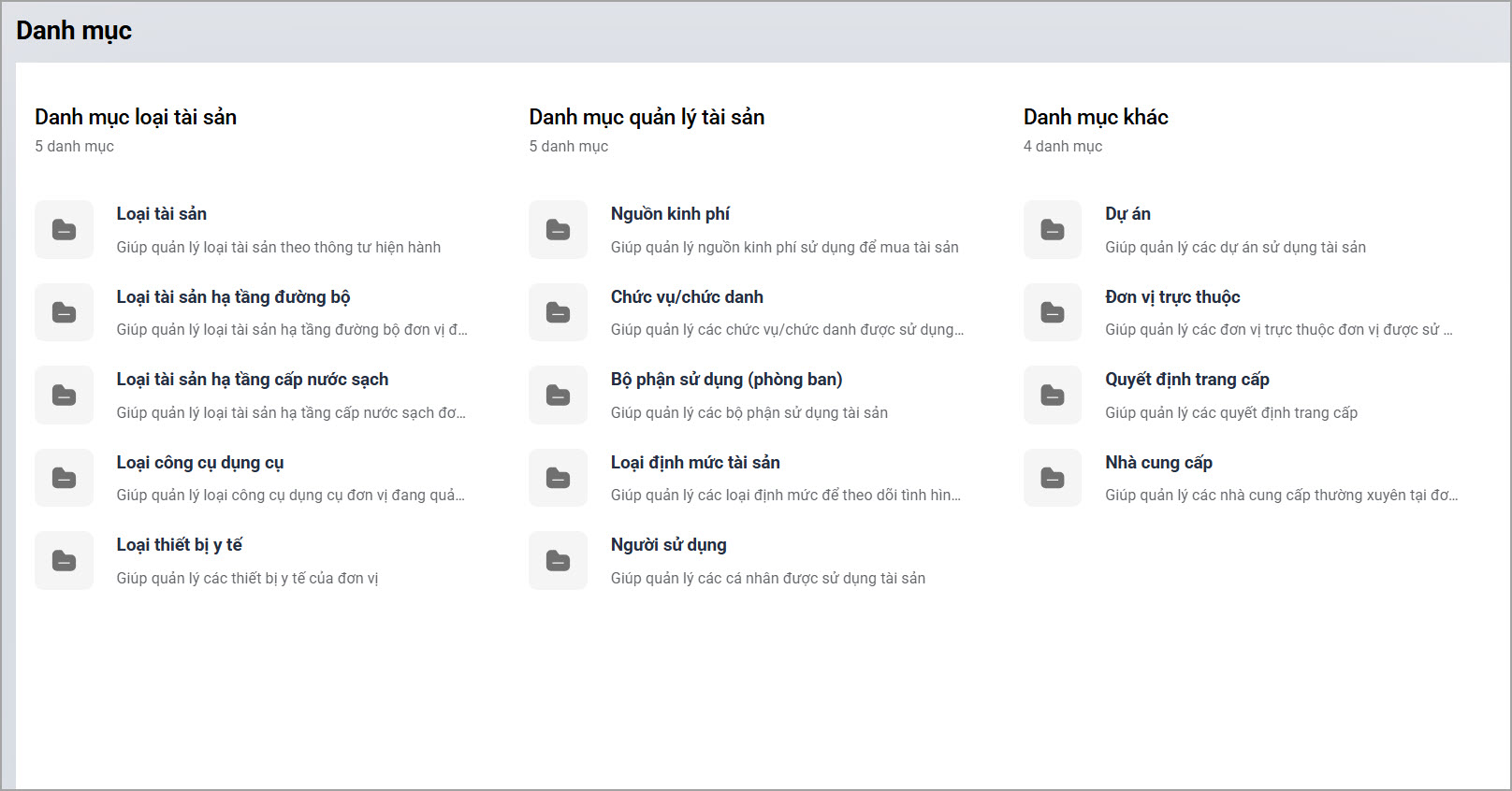 Mục đích: Giúp Cán bộ QLTS đơn vị khai báo các thông tin danh mục cơ bản khi bắt đầu sử dụng phần mềm.