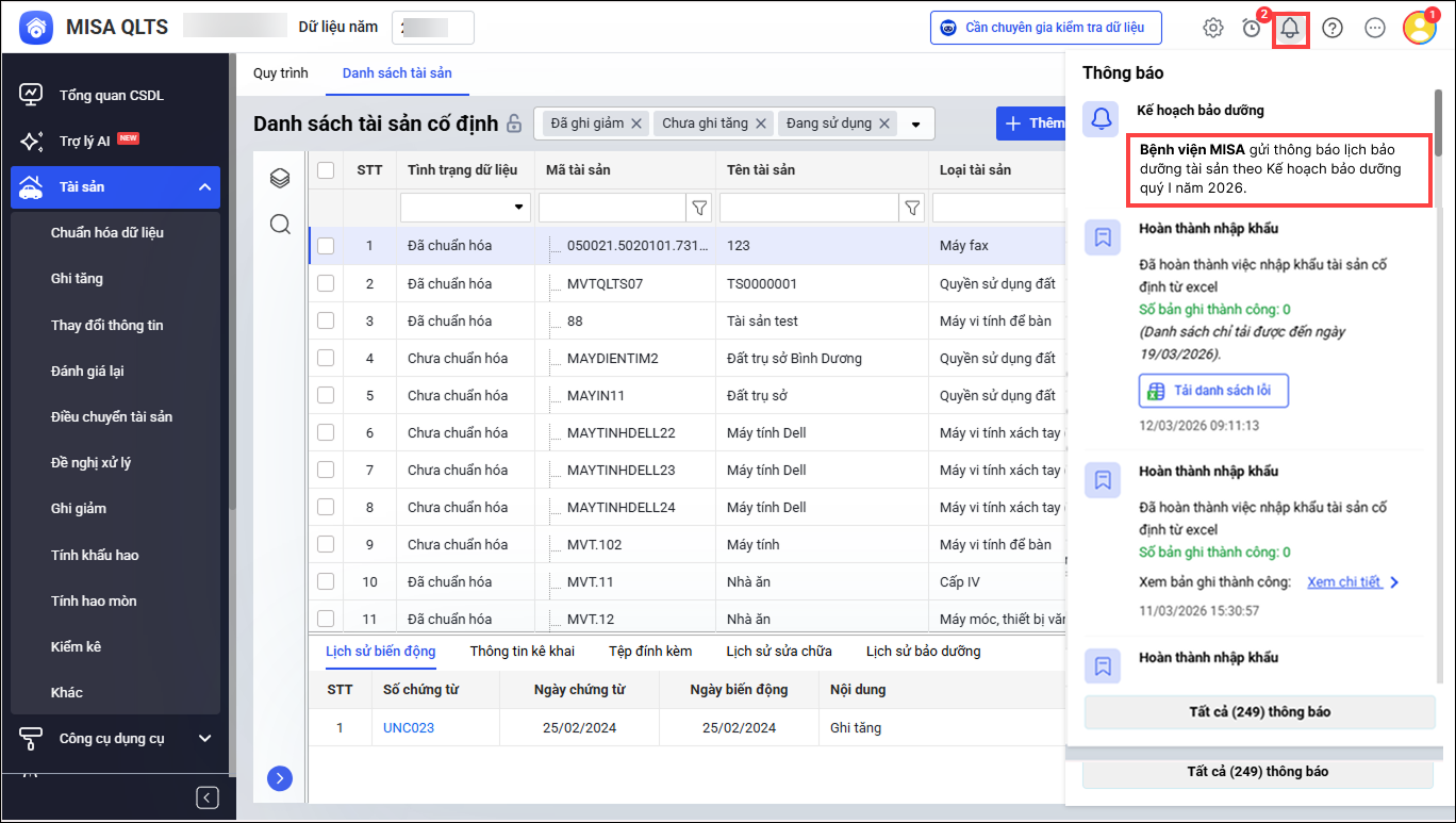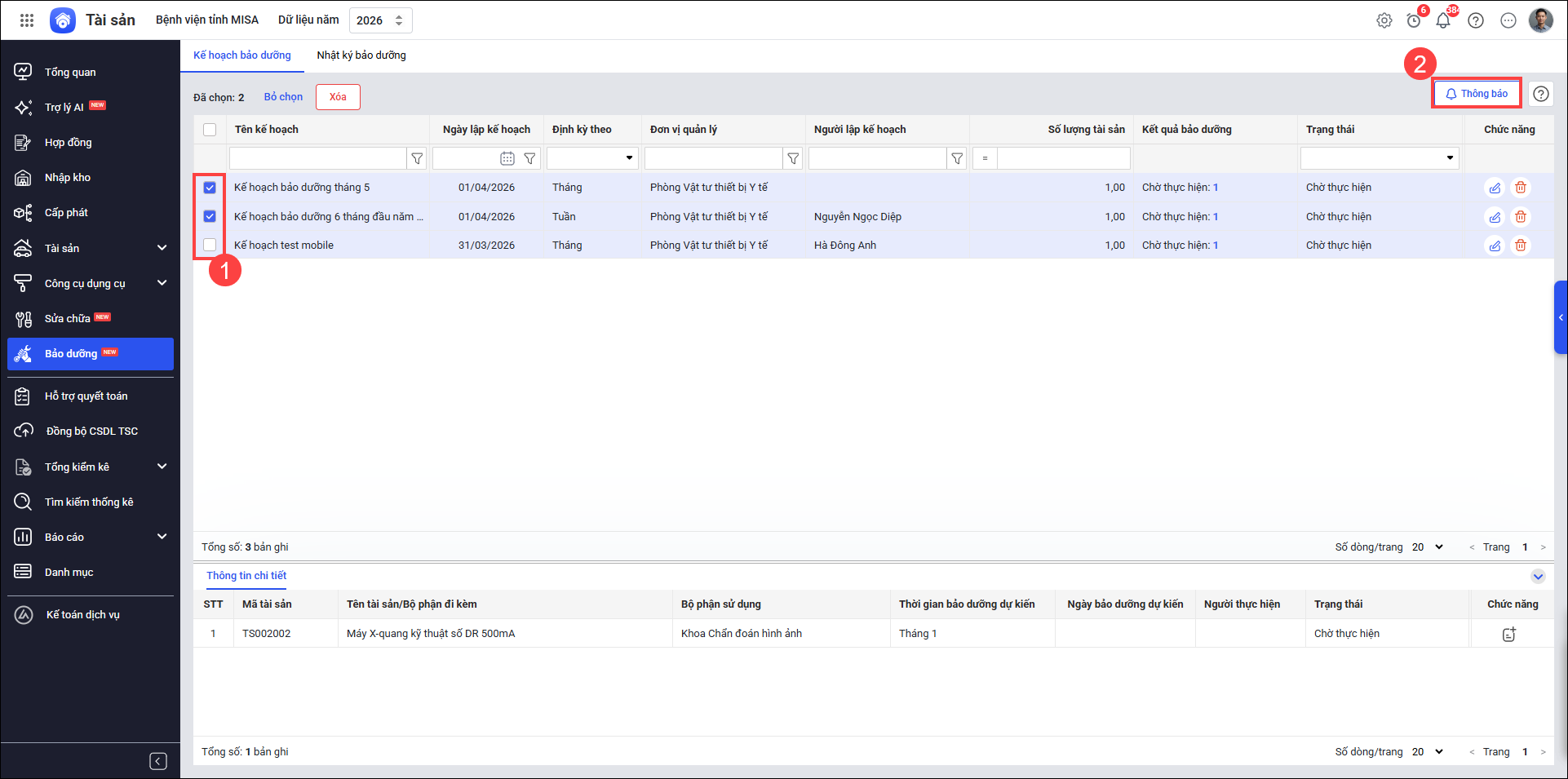 - Cán bộ quản lý tài sản vào Bảo dưỡng. Tích chọn tên kế hoạch sau đó nhấn nút Thông báo