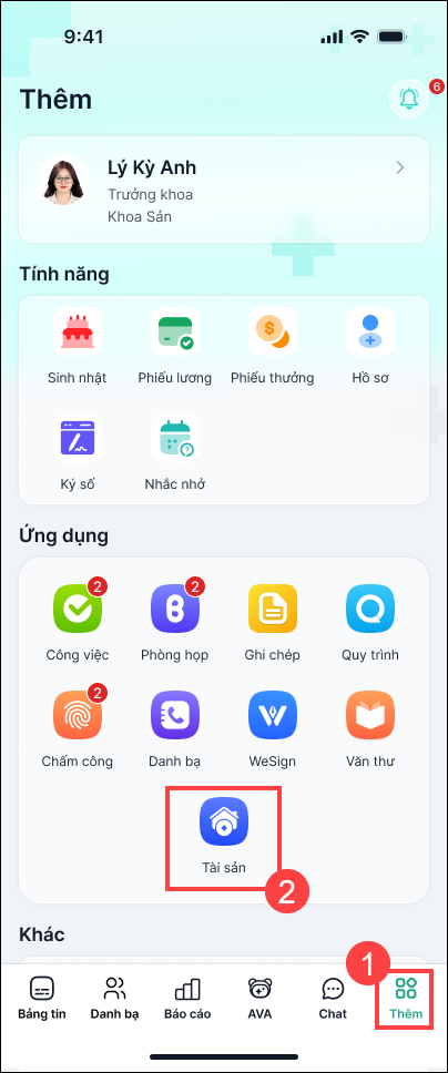 1. Vào ứng dụng iHOS mobile, chọn Thêm. Nhấn chọn Tài sản