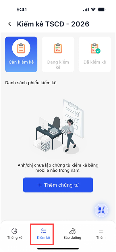 3. Trên ứng dụng Tài sản cũng bổ sung thêm phân hệ Kiểm kê, giúp cán bộ QLTS theo dõi được danh sách phiếu kiểm kê theo các trạng thái: Cần kiểm kê; Đang kiểm kê; Đã kiểm kê