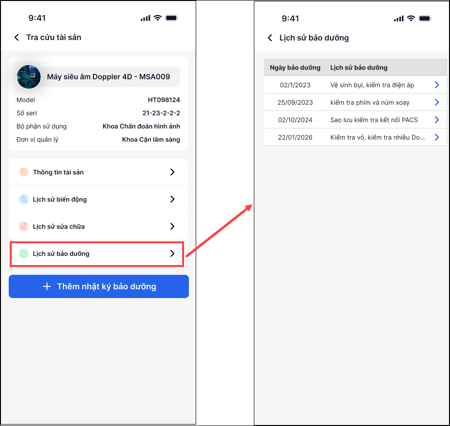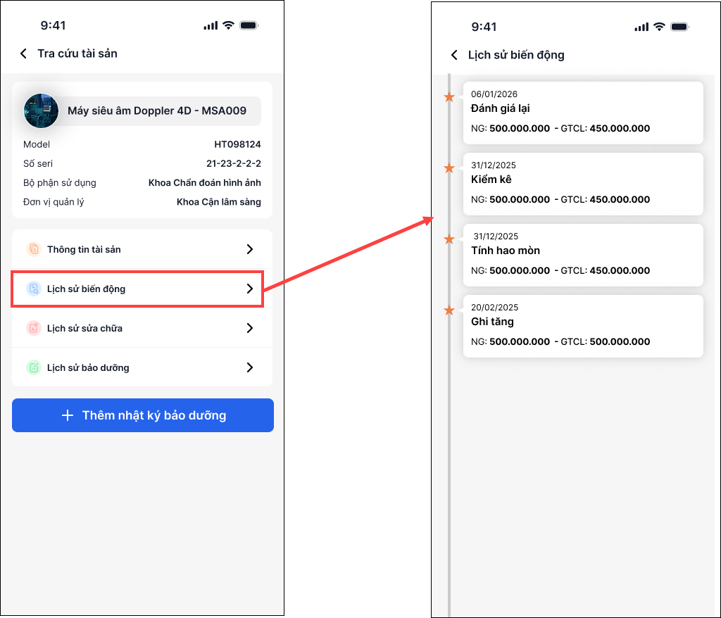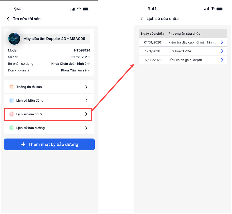 • Tra cứu thông tin lịch sử sửa chữa/bảo dưỡng của tài sản