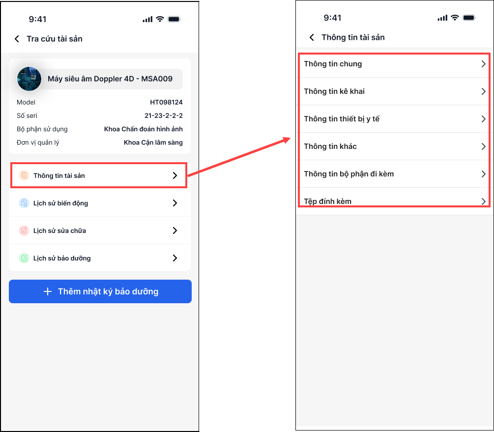 2. Nhấn Thông tin tài sản sau đó nhấn để xem chi tiết các thông tin liên quan tới tài sản như: Thông tin kê khai; Thông tin thiết bị y tế; Thông tin khác; Thông tin bộ phận đi kèm…