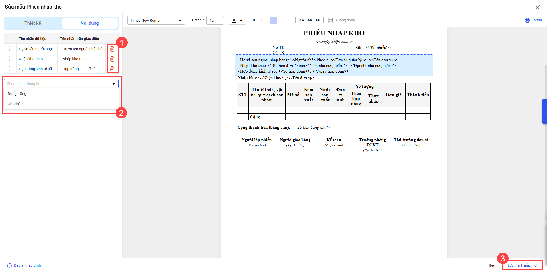 2. Hướng dẫn cán bộ quản lý tài sản tùy chỉnh mẫu phiếu nhập kho, cấp phát