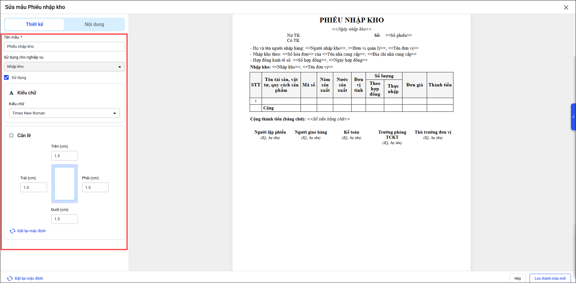 2. Chương trình hiển thị mẫu phiếu nhập kho hiện tại. Nhấn Sửa mẫu để cập nhật và bổ sung thêm thông tin cho đúng với quy định của đơn vị