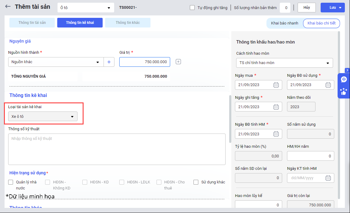 - Để phân loại tài sản chính xác, cần kê khai đúng Loại tài sản kê khai tại mục Thông tin kê khai. (Lấy theo thông tin Loại tài sản và Nguyên giá tài sản).