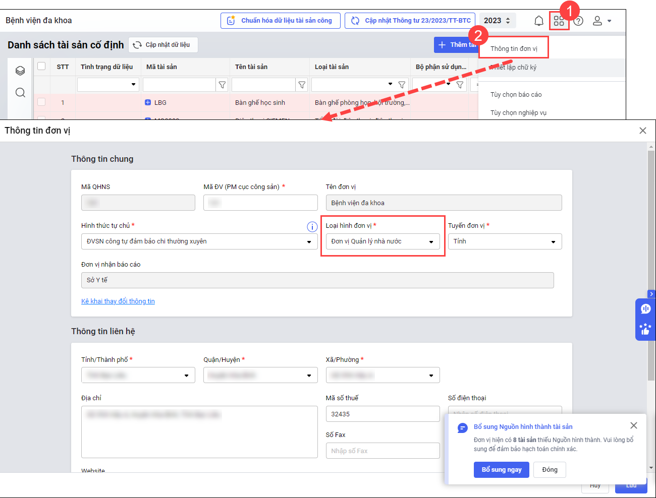 - Để Mẫu số 08b-ĐK-TSC (Phần 2) lên số liệu, cần khai báo đúng thông tin Loại hình đơn vị tại Hệ thống\Thông tin đơn vị.