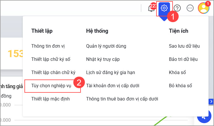 Tại góc bên phải màn hình, nhấn vào biểu tượng bánh răng thiết lập, chọn Tùy chọn nghiệp vụ