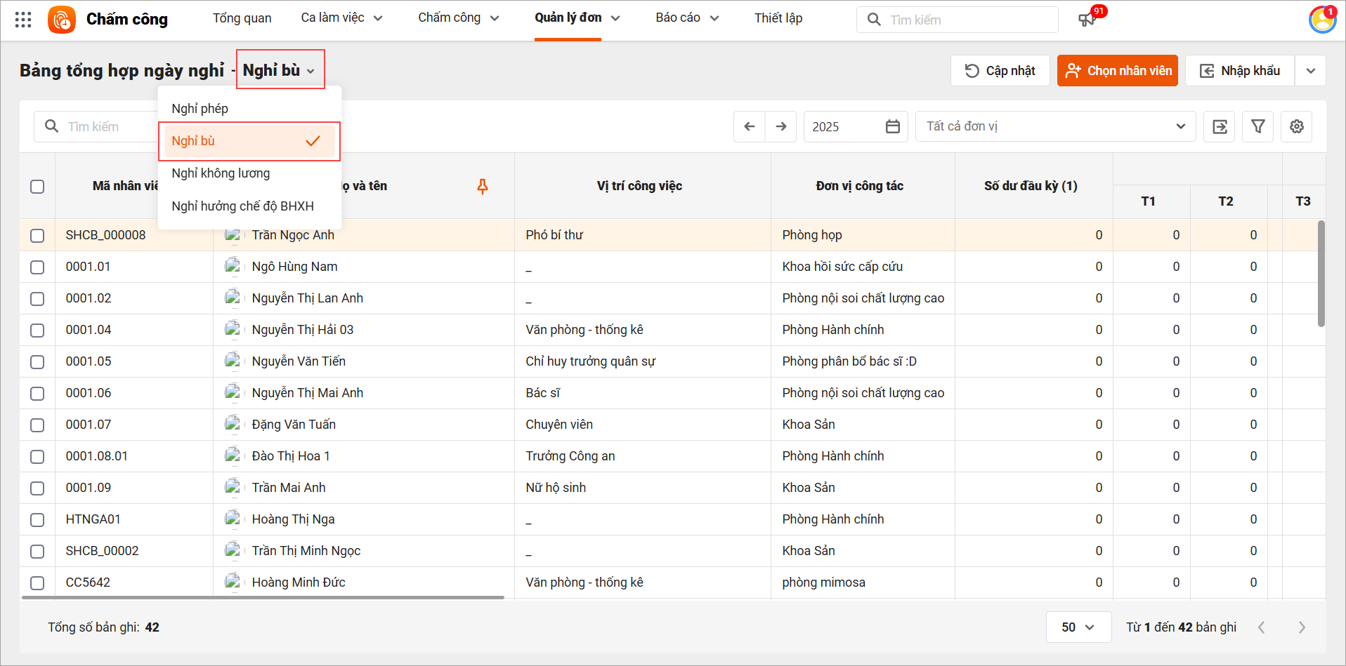 Trường hợp 1: Ghi nhận nhanh quỹ nghỉ bù còn tồn/phát sinh trong kỳ của CBNV lên phần mềm