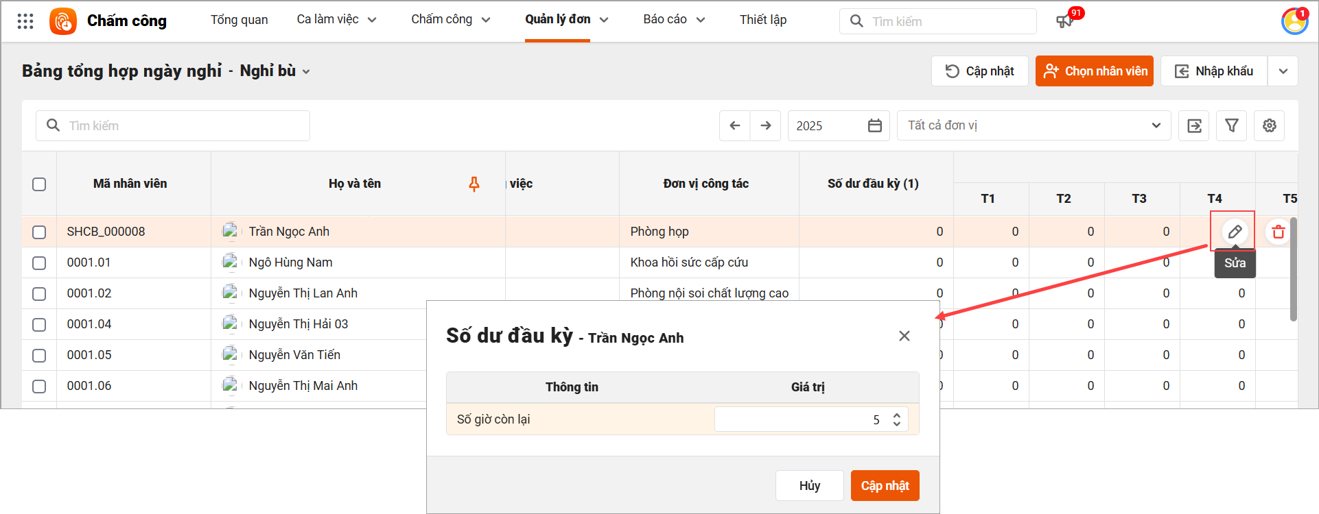 Chỉnh sửa số dư đầu kỳ và số giờ làm thêm nghỉ bù