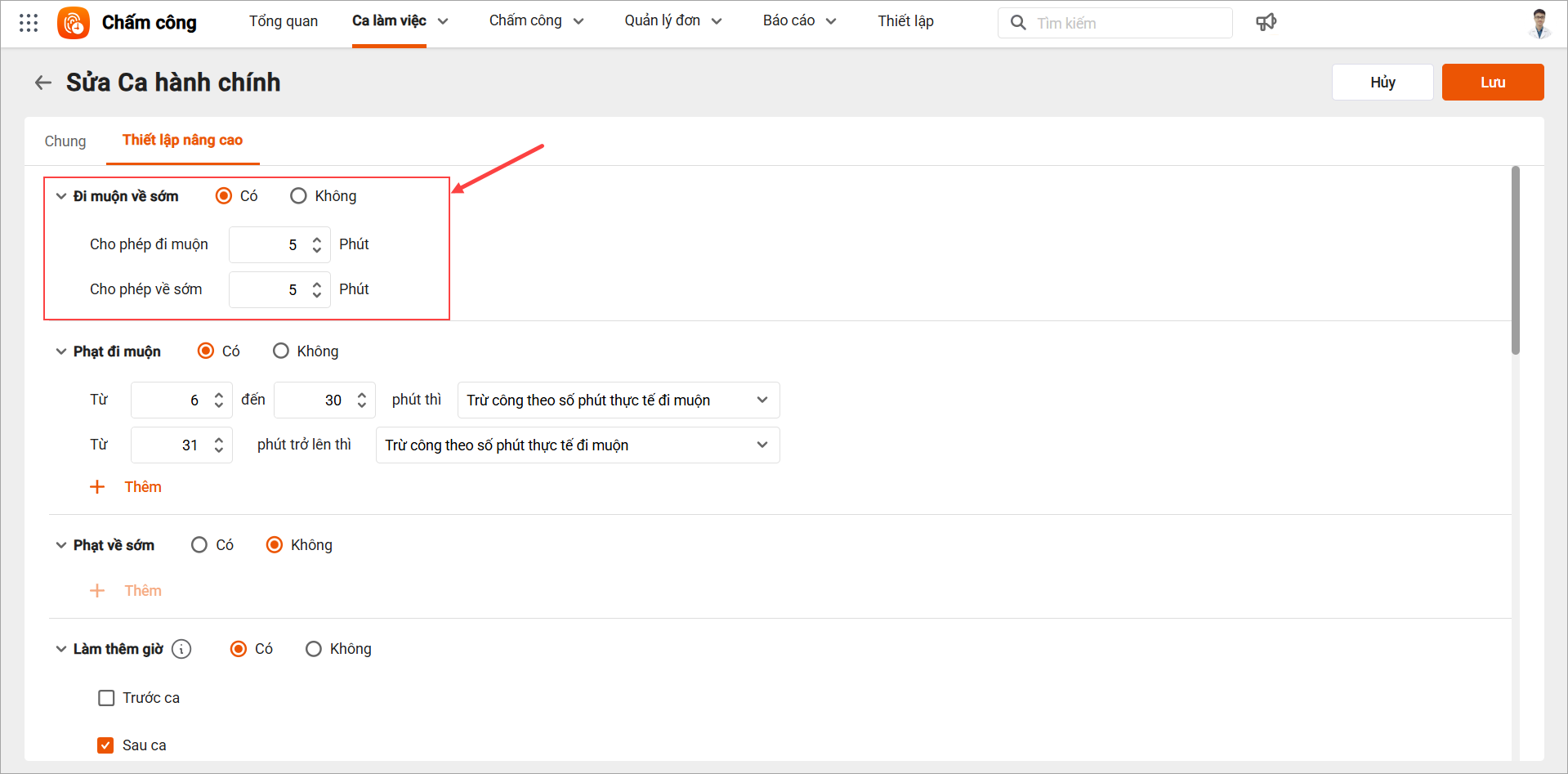Bước 1: Thiết lập quy định đi muộn, về sớm với mỗi ca làm việc