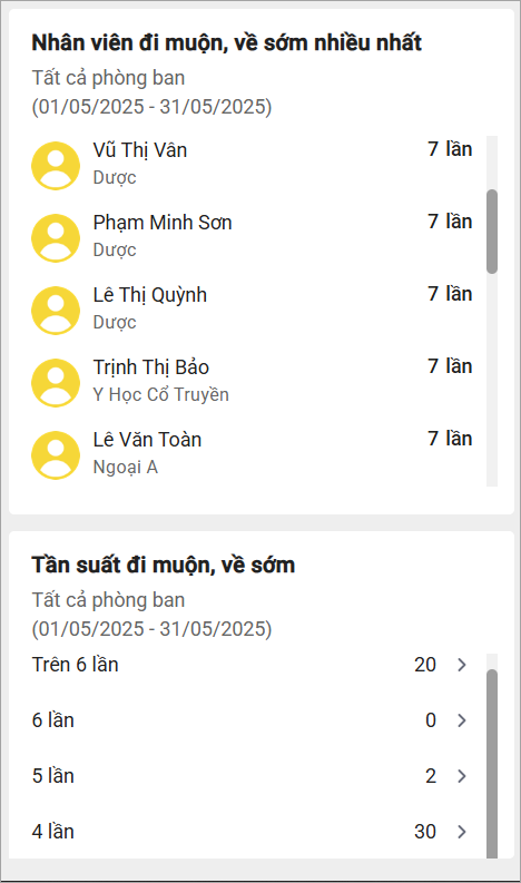 Hàng ngày/tuần/tháng, Cán bộ và quản lý có thể theo dõi các biểu đồ tổng quan và báo cáo thống kê về tình hình đi muộn, về sớm của nhân viên.