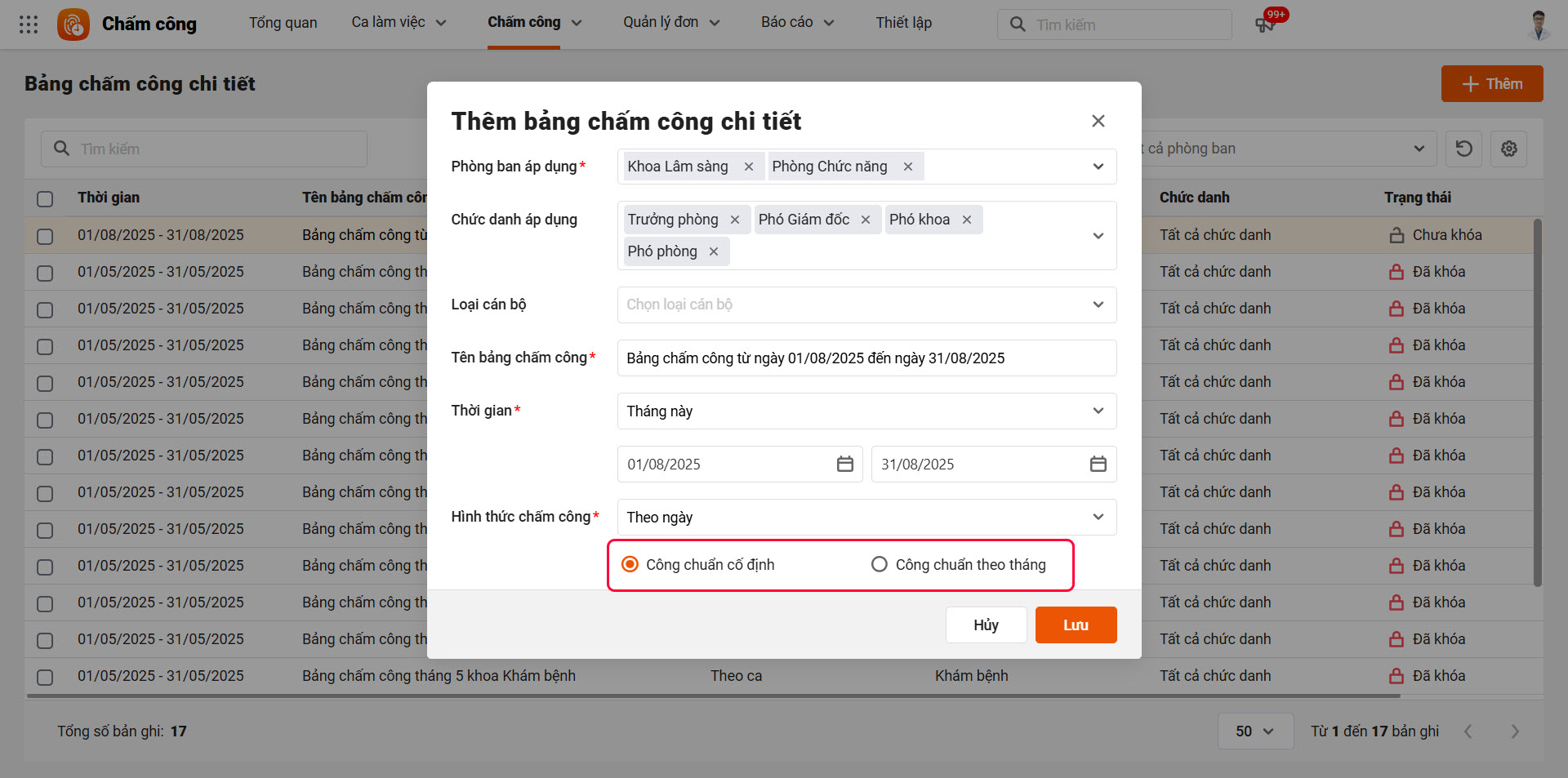 Khi tạo bảng chấm công chi tiết, phần mềm sẽ yêu cầu lựa chọn hình thức tính công là công chuẩn theo tháng hay công chuẩn cố định. Việc này sẽ ảnh hưởng đến quy tắc tính số công chuẩn và số công hưởng lương của nhân viên trên bảng chấm công tổng hợp, vì vậy cần lựa chọn đúng hình thức.