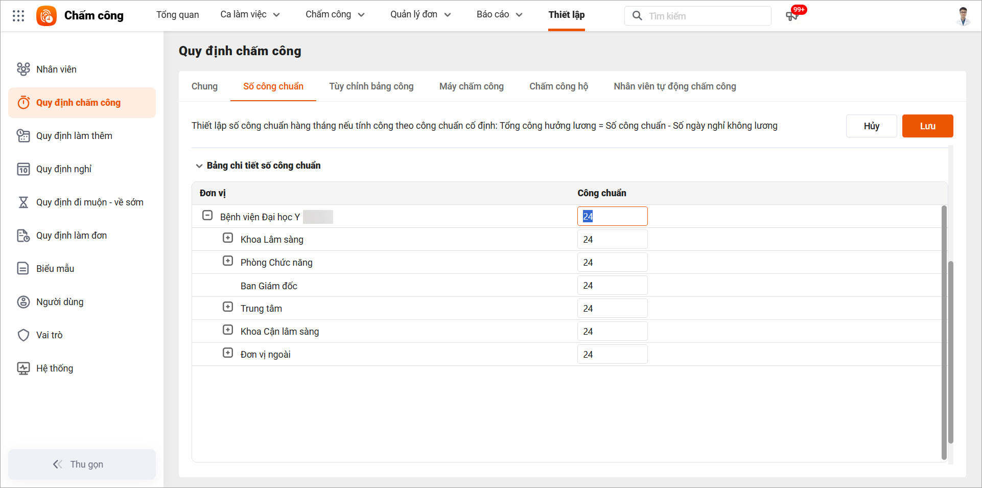 Số công chuẩn cố định này sẽ được khai báo tại phân hệ Thiết lập\Quy định chấm công\Số công chuẩn. Xem hướng dẫn chi tiết tại đây.