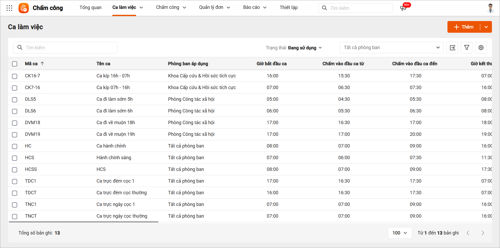 Tại phân hệ Ca làm việc: khai báo danh sách các ca mà đơn vị đang có.