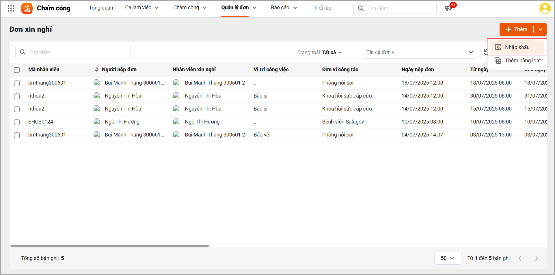 – Quản lý truy cập danh sách đơn xin nghỉ: Vào mục Đơn xin nghỉ trong phần mềm để xem toàn bộ các đơn đã được nộp bởi CBNV.