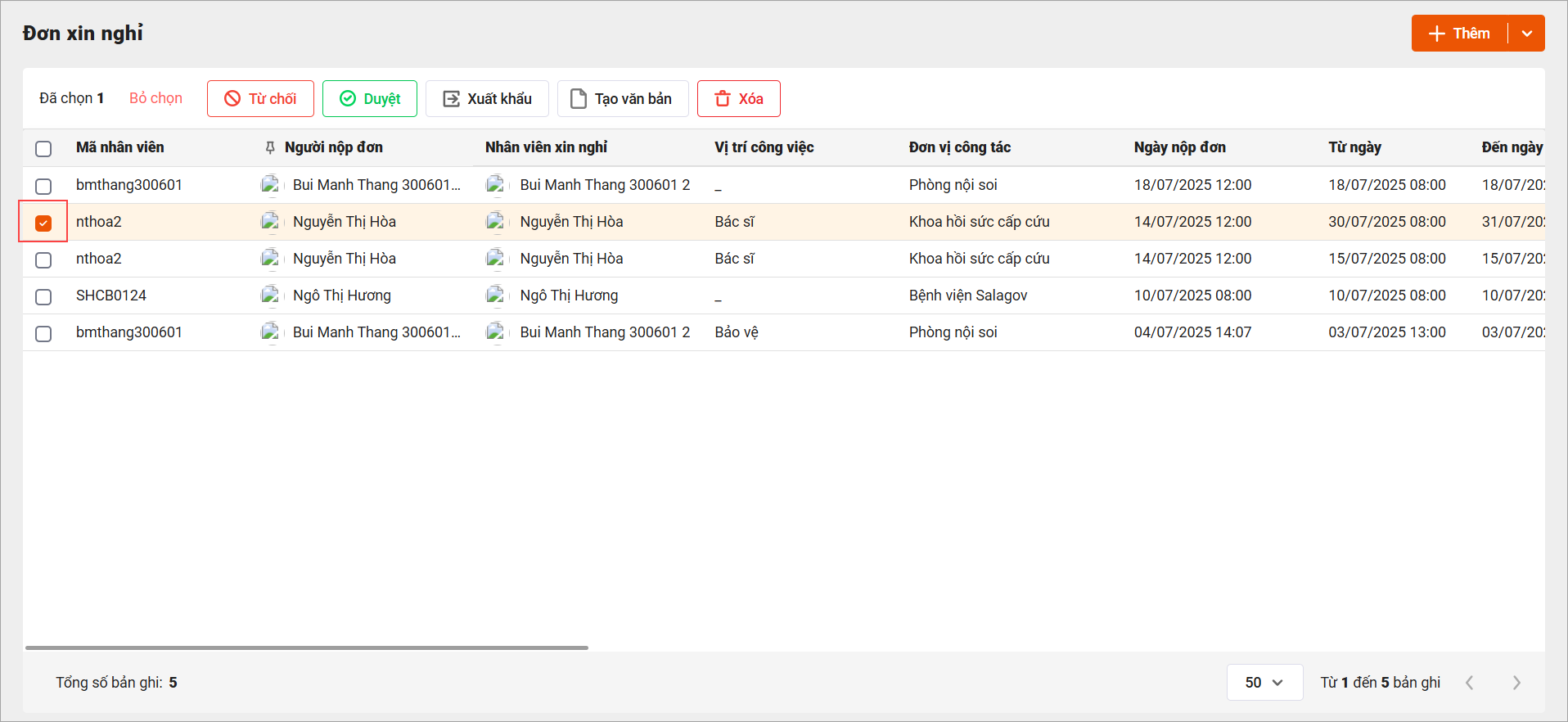 – Chọn đơn cần duyệt: Tích chọn đơn xin nghỉ của nhân viên cần duyệt trong danh sách (ví dụ đơn của Nguyễn Thị Hòa đang ở trạng thái “Chờ duyệt”).
