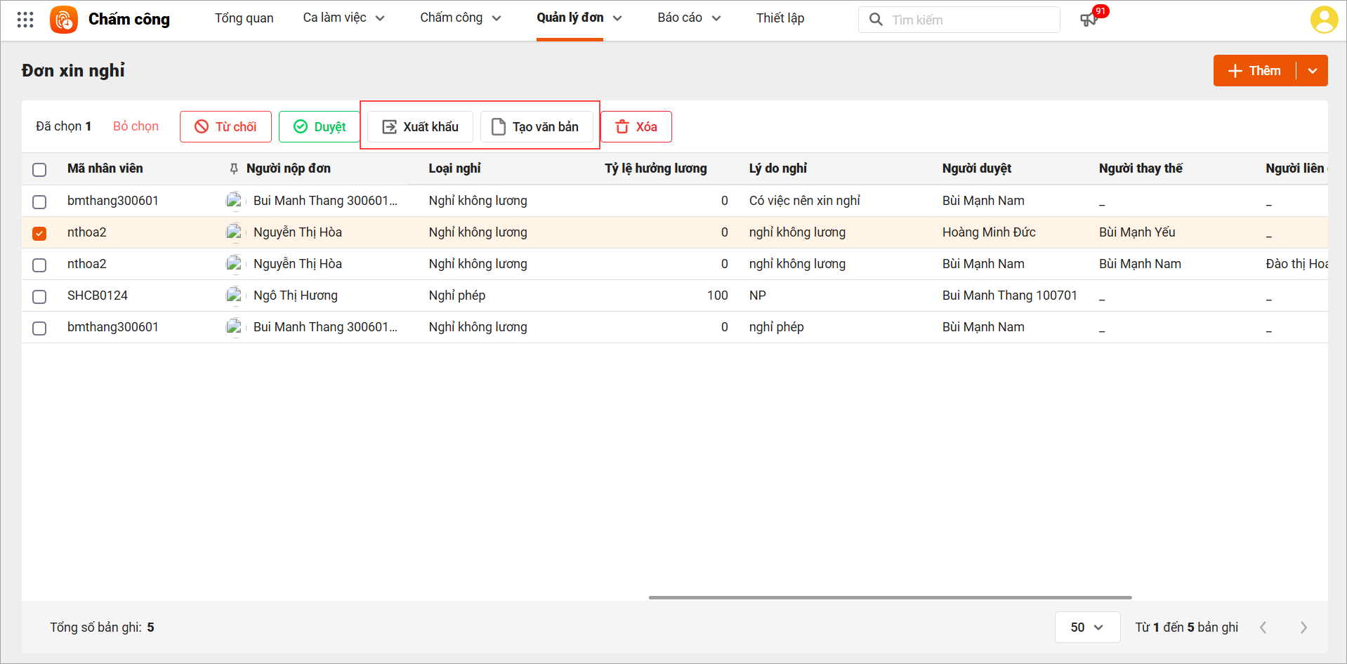 – Xuất khẩu hoặc tạo văn bản (nếu cần): Anh/chị có thể xuất khẩu đơn xin nghỉ hoặc tạo văn bản liên quan bằng các nút tương ứng phía trên danh sách.