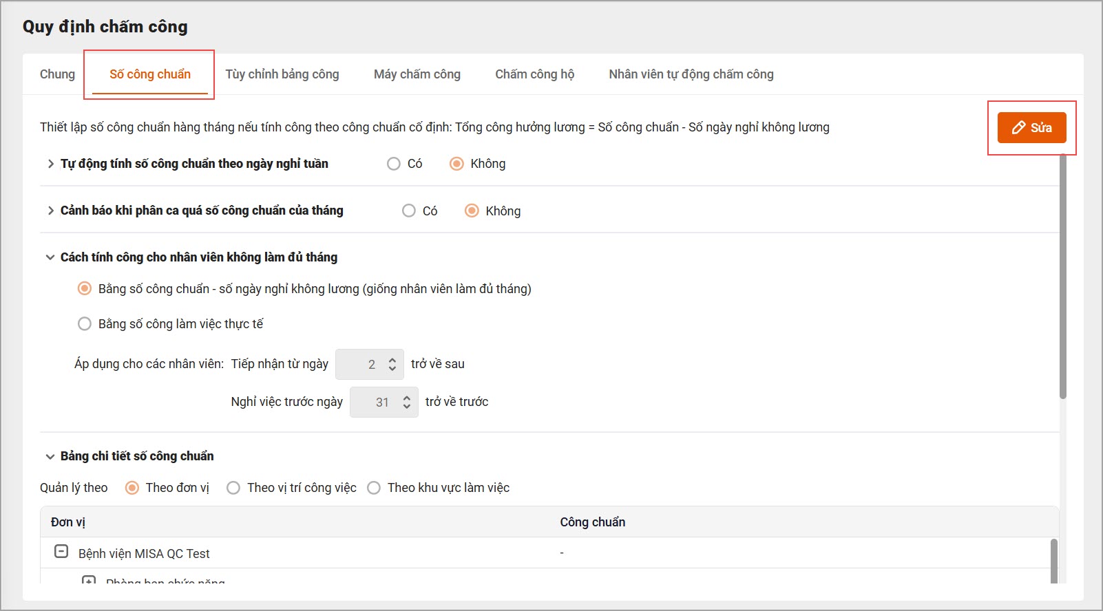 – Tại mục Số công chuẩn, nhấn Sửa để thiết lập các quy định liên quan đến số công chuẩn bao gồm: