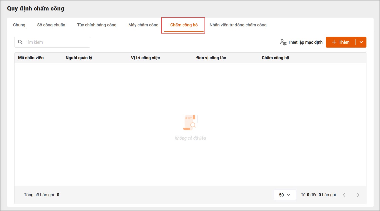 – Truy cập vào phân hệ Thiết lập\Chấm công hộ.
