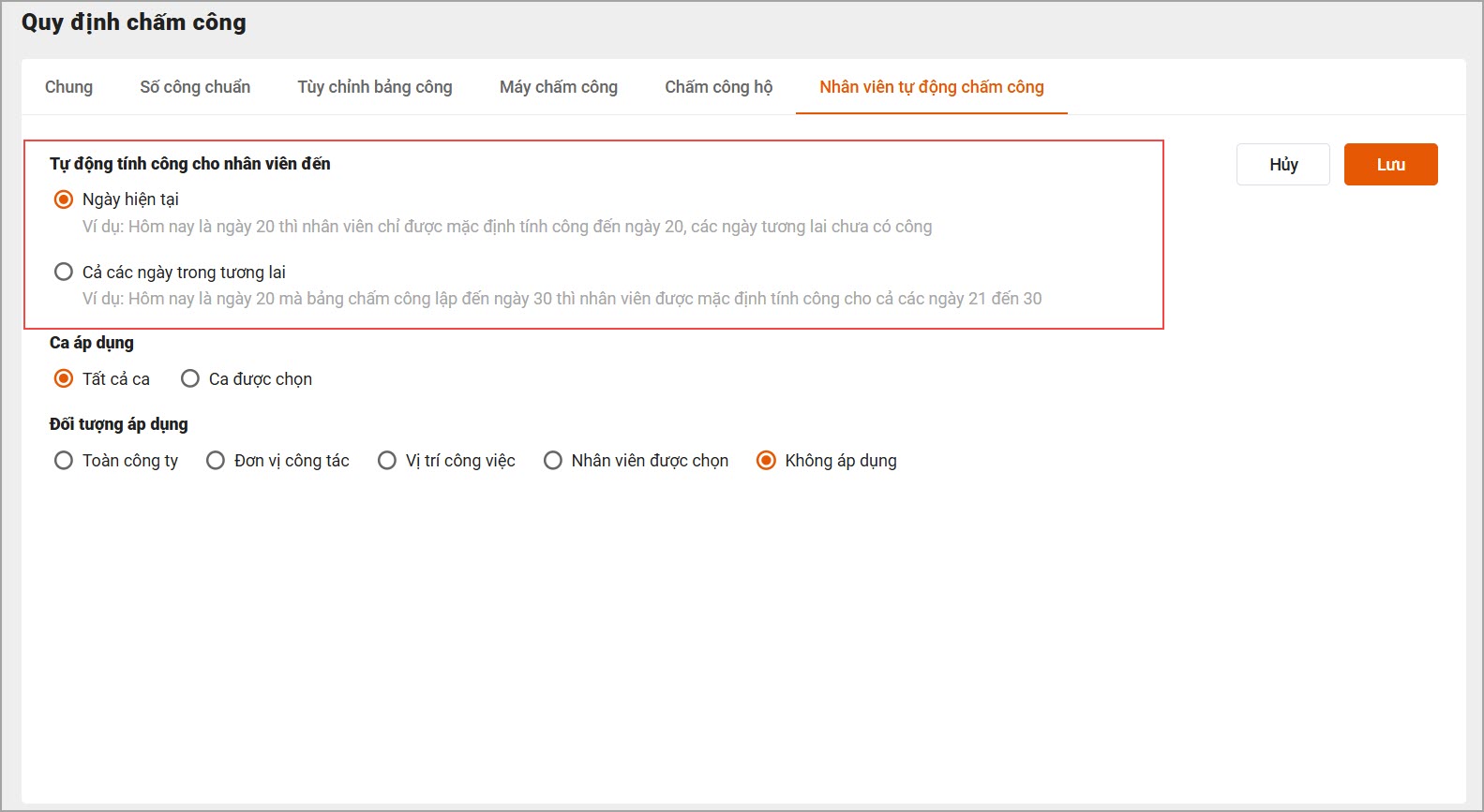 – Cán bộ lựa chọn đối tượng áp dụng quy tắc tự động chấm công, trong đó: