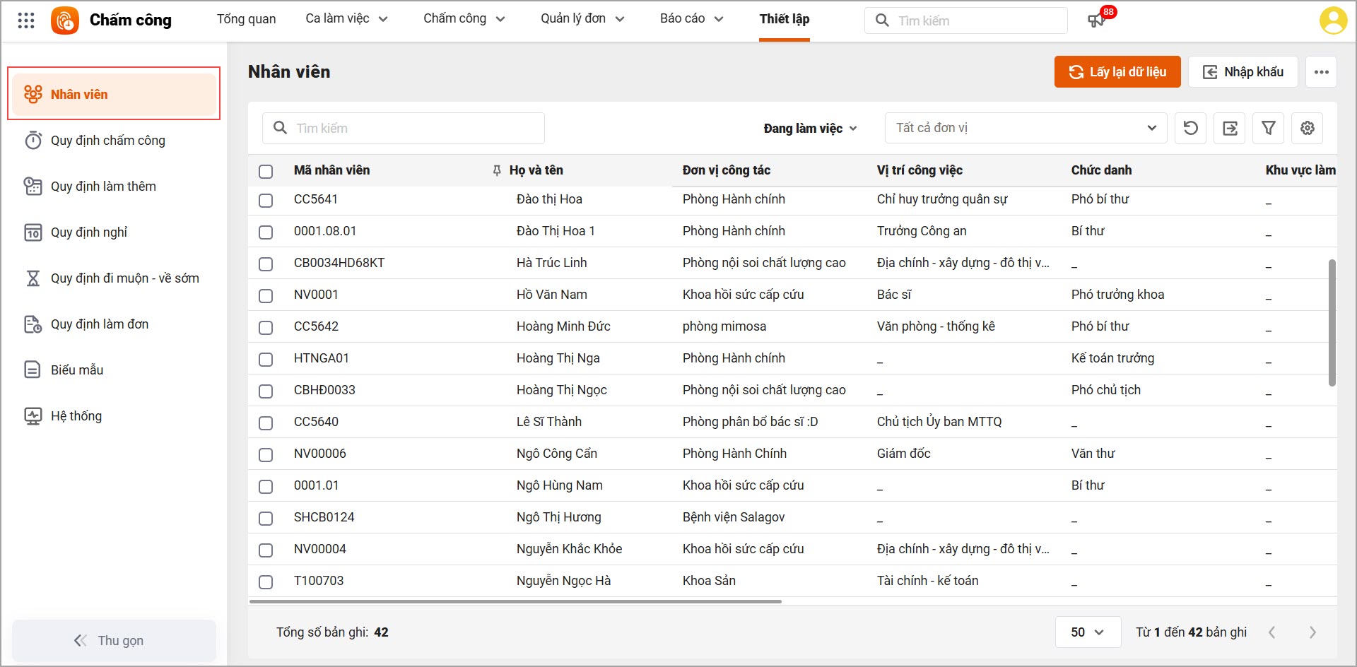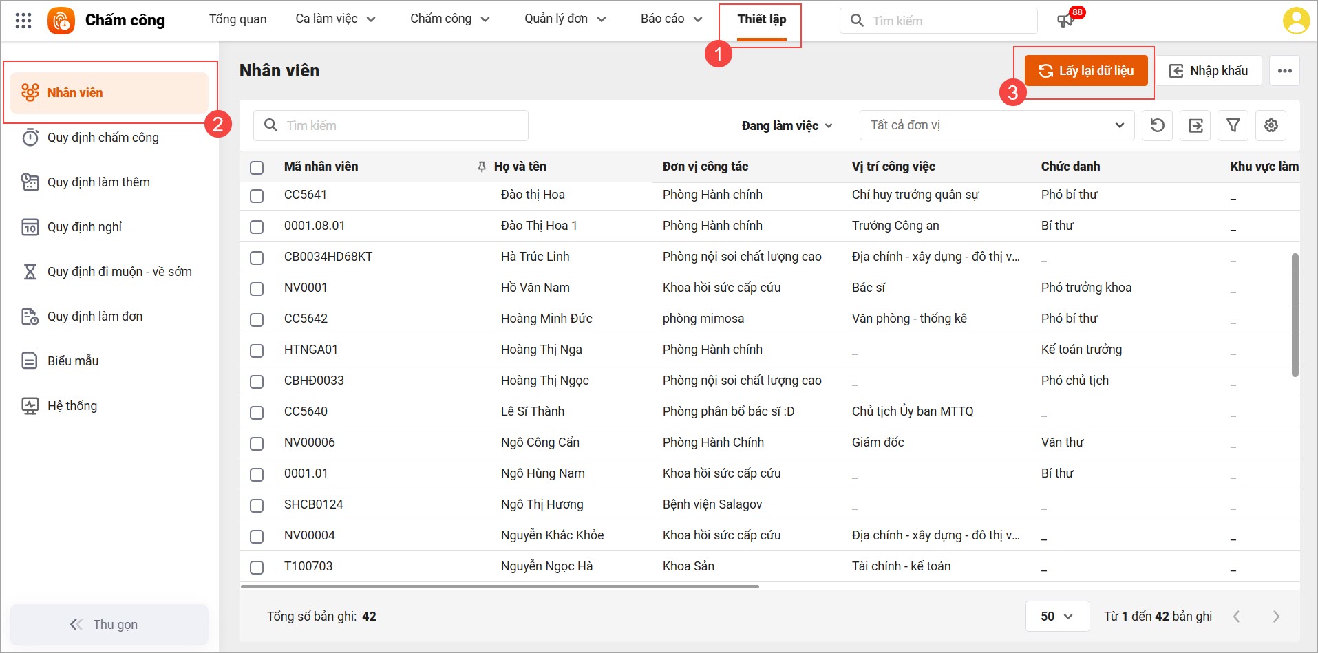 • Tại phân hệ Thiết lập\Nhân viên: Nhấn Lấy lại dữ liệu.