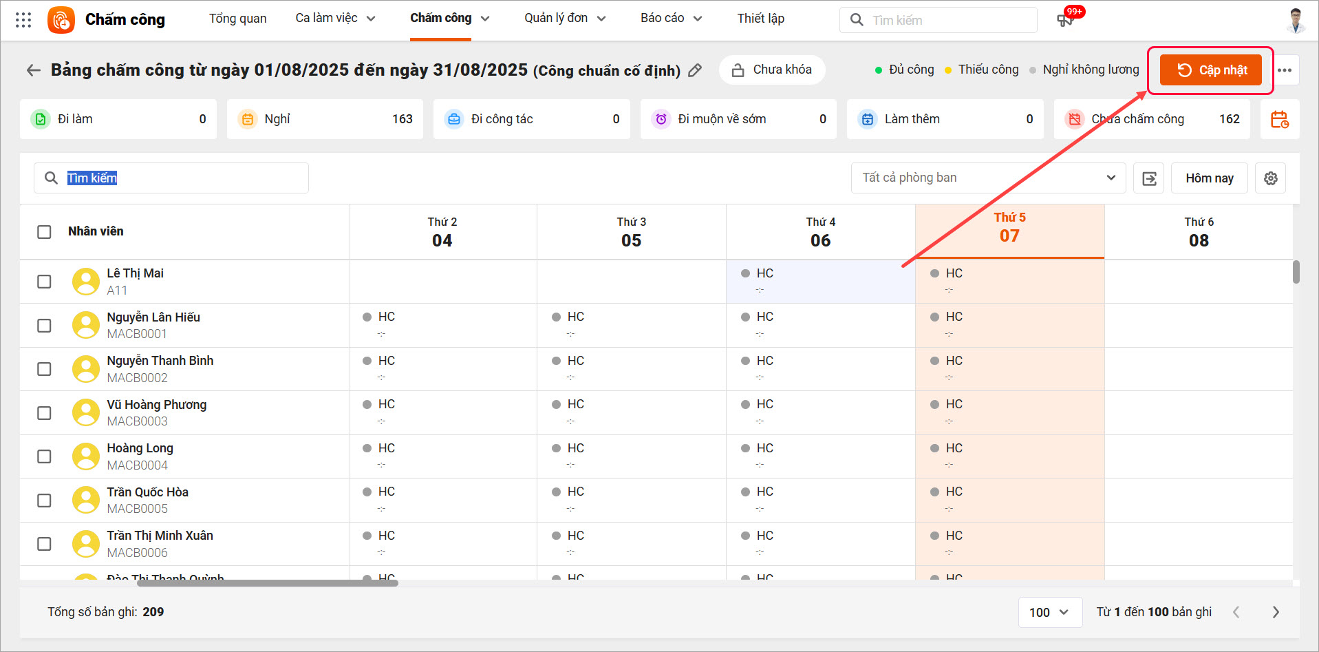 4. Chưa nhấn Cập nhật trên Bảng chấm công chi tiết
