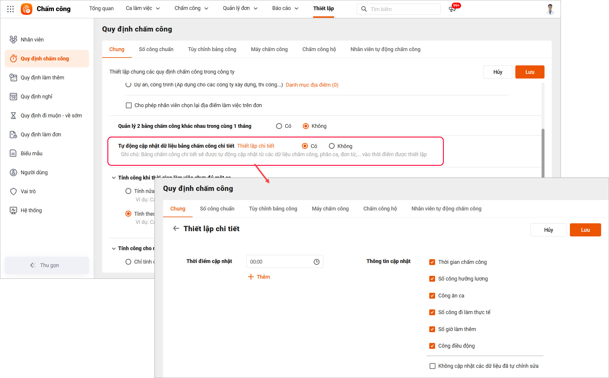 → Hoặc để tiện ích hơn, Cán bộ có thể thiết lập tự động cập nhật dữ liệu trên Bảng chấm công chi tiết.