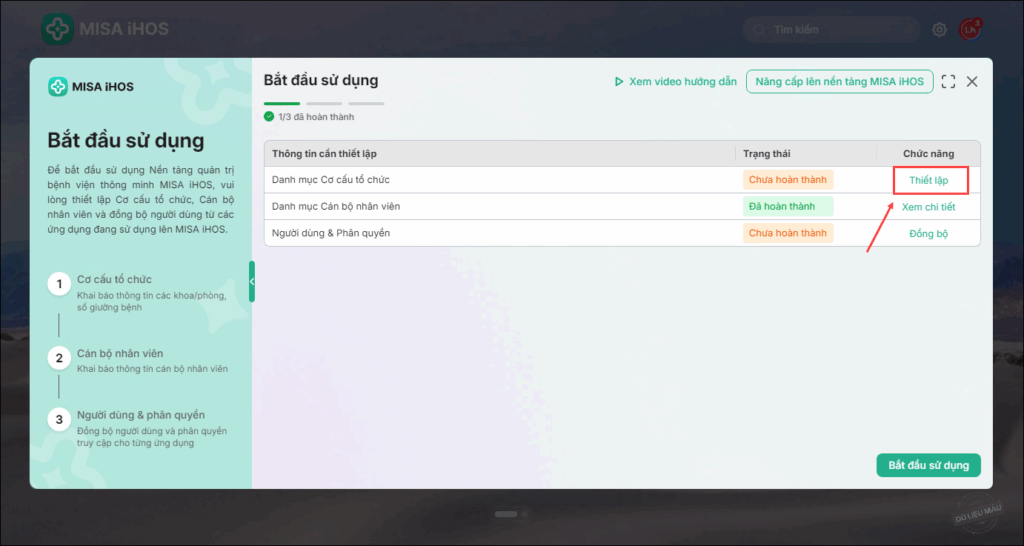 - Khi anh/chị đăng nhập vào nền tảng MISA iHOS lần đầu tiên, hệ thống sẽ hiển thị giao diện Bắt đầu sử dụng. Tại thông tin Danh mục Cơ cấu tổ chức, chọn Thiết lập.