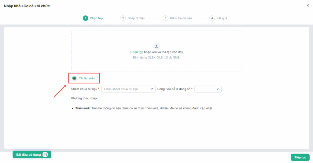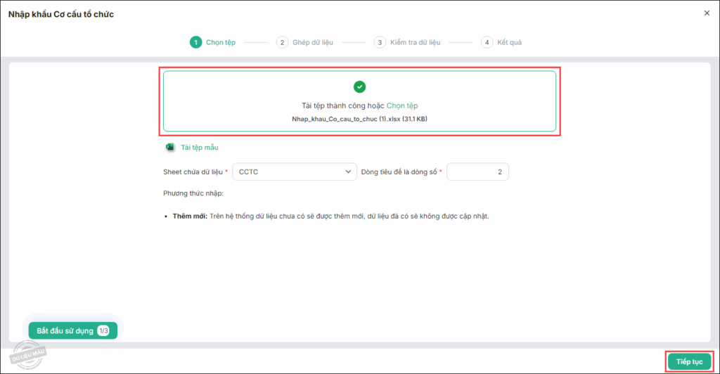 - Nhấn Tải tệp mẫu để tải mẫu có sẵn của phần mềm. Nếu sử dụng tệp mẫu, chương trình sẽ tự động nhận biết các cột trên tệp dữ liệu với các thông tin tương ứng trên chương trình.