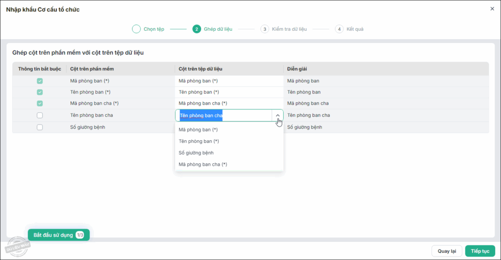 - Chương trình tự động ghép thông tin ở Cột trên tệp dữ liệu với Cột trên phần mềm. Nếu chương trình chưa ghép dữ liệu hoặc ghép chưa đúng, anh chị có thể chọn lại thông tin Cột trên tệp dữ liệu để ghép cho chính xác.