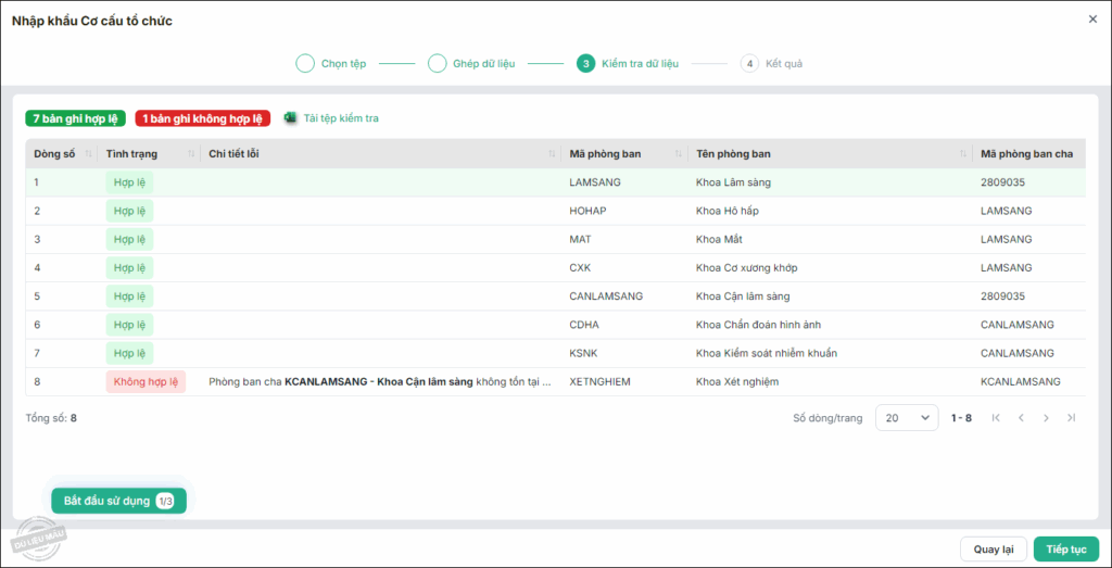 - Bản ghi không hợp lệ được đánh dấu đỏ và hiển thị nguyên nhân ở cột Chi tiết lỗi.