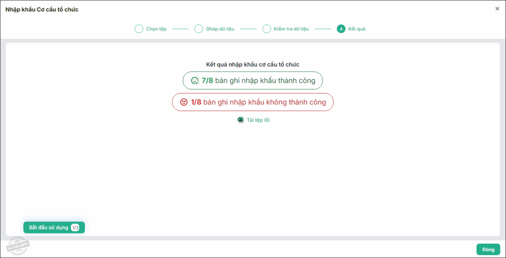 - Phần mềm hiển thị kết quả nhập khẩu. Trường hợp có bản ghi nhập khẩu không thành công, có thể chọn Tải tệp lỗi để xem chi tiết.