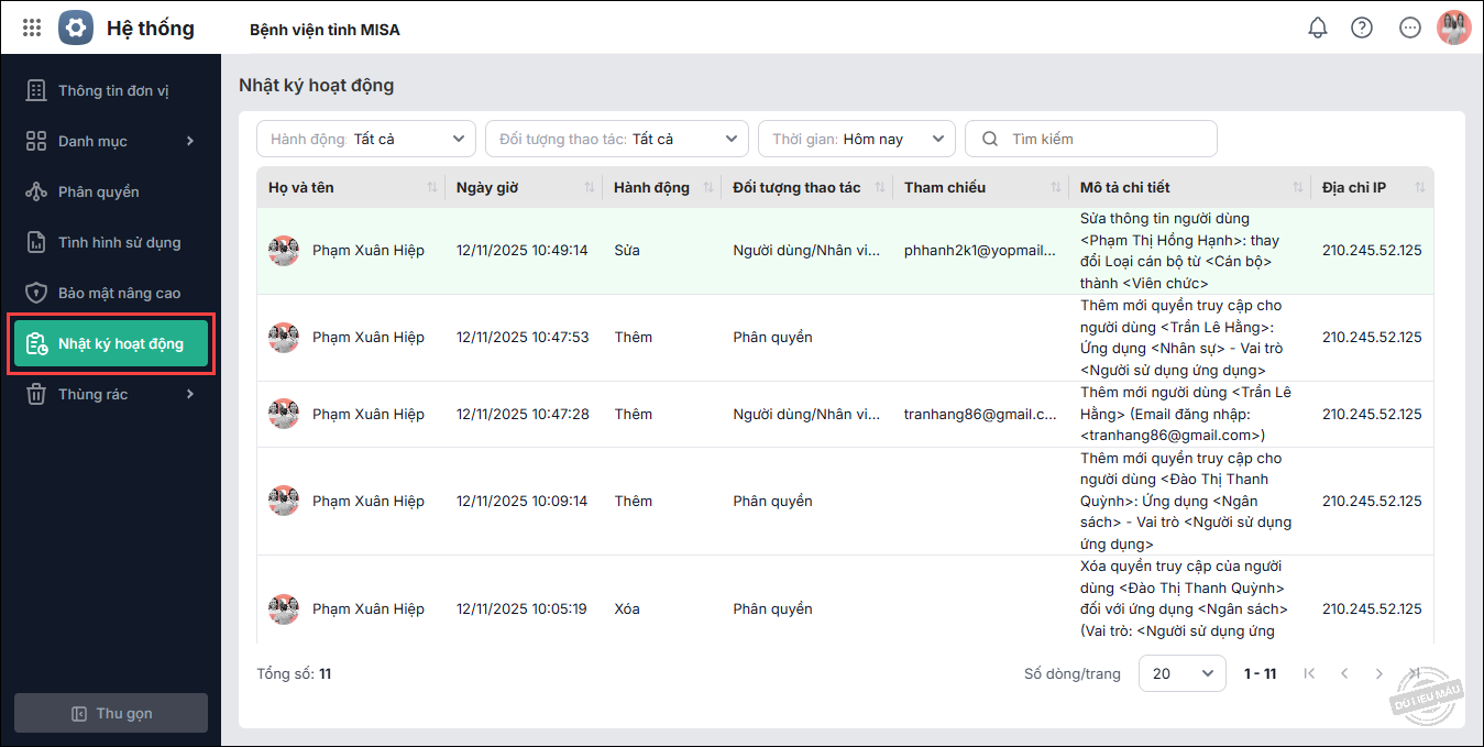 Vào phân hệ Nhật ký hoạt động, chương trình sẽ hiển thị toàn bộ hoạt động của người dùng từ thời điểm đăng nhập trên hệ thống cho tới khi đăng xuất. Anh/chị có thể theo dõi ai đã thao tác thêm, sửa, xóa, điều chỉnh… dữ liệu trên hệ thống.