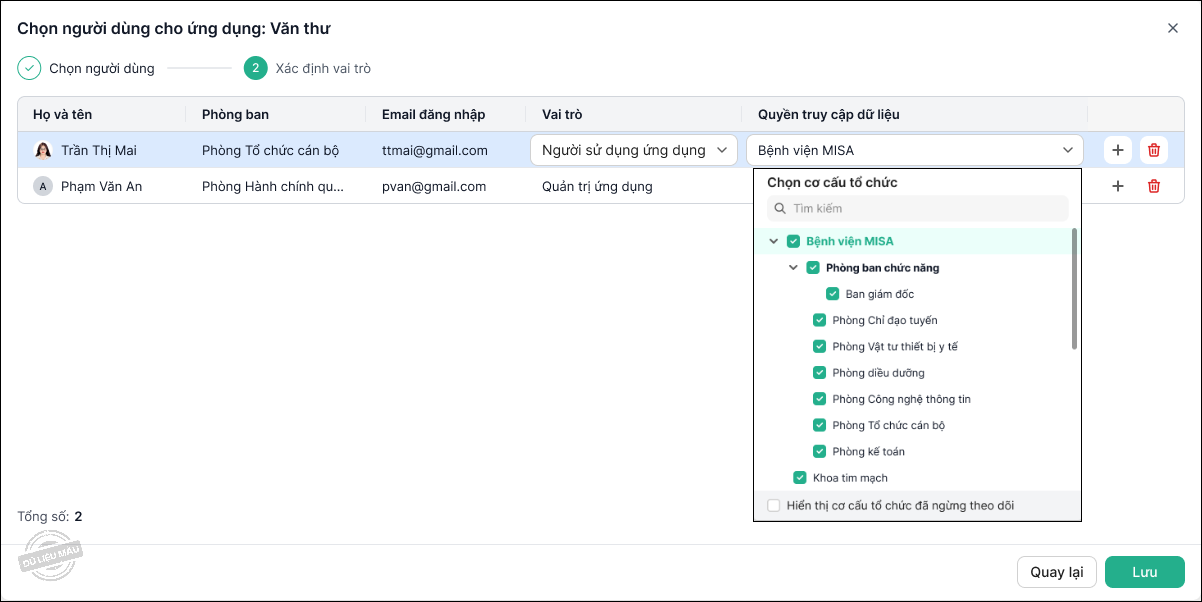 - Thiết lập Quyền truy cập dữ liệu: Chọn phòng ban/đơn vị người dùng được phép truy cập dữ liệu.