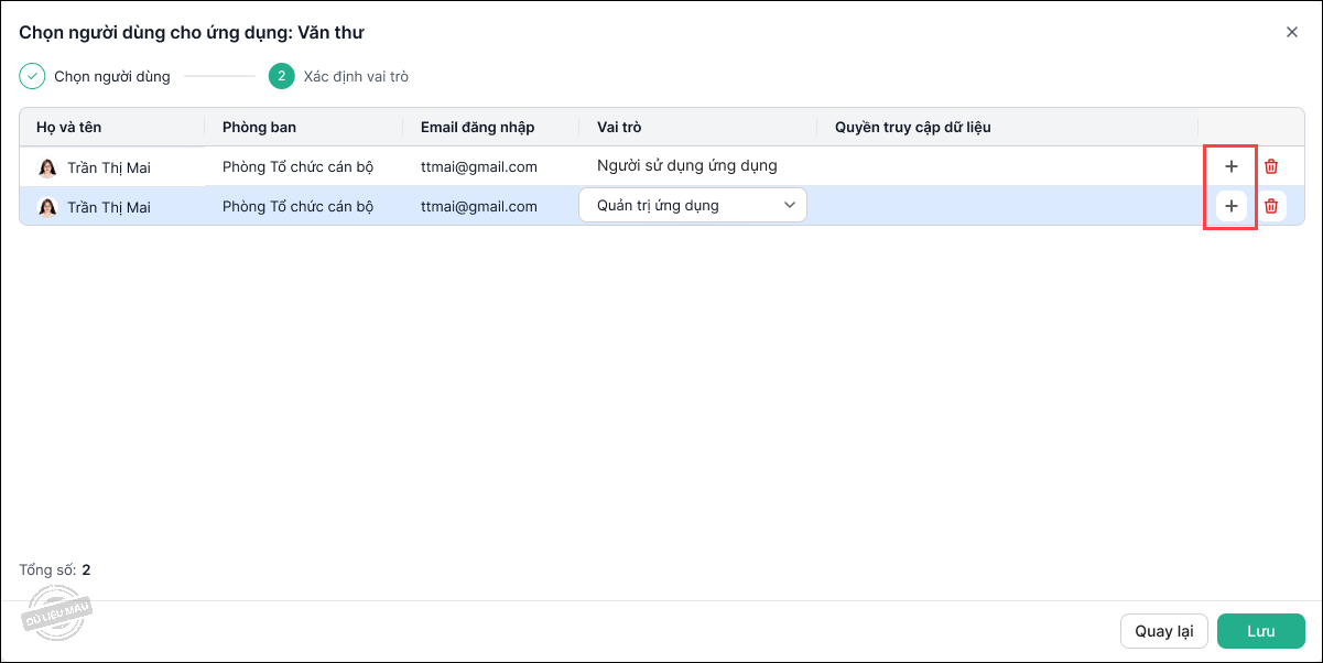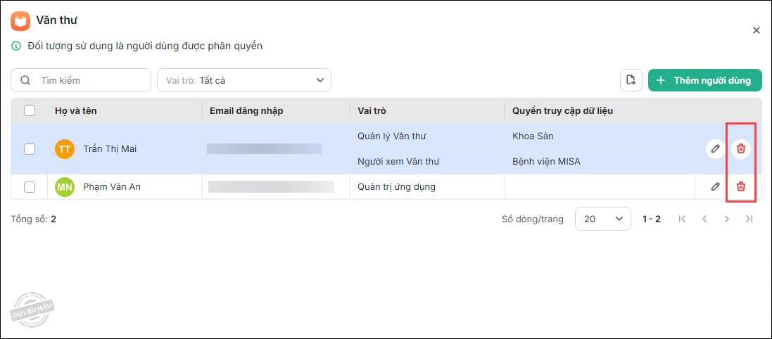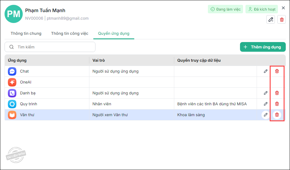 - Để xóa bỏ vai trò của người dùng khỏi ứng dụng, tại danh sách người dùng được phân quyền, chọn vào biểu tượng Xóa ở cuối dòng.