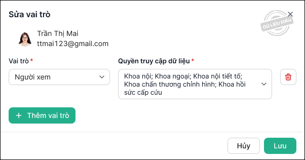 - Trường hợp cần thêm vai trò cho cùng 1 người dùng, nhấn vào dấu cộng ở cuối dòng, chọn vai trò và quyền truy cập dữ liệu.