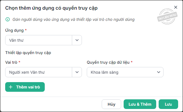 - Nhấn Lưu để hoàn thành hoặc Lưu và Thêm để tiếp tục phân quyền cho người dùng này vào ứng dụng khác.