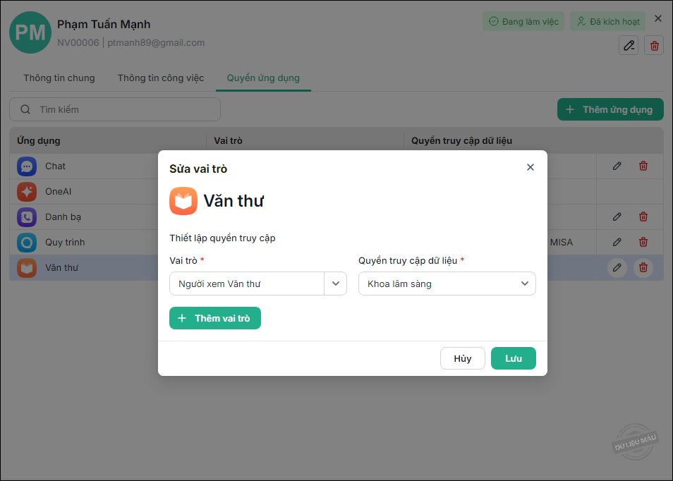 - Để sửa vai trò của người dùng, chọn vào biểu tượng Sửa ở ứng dụng cần sửa, chọn lại vai trò và nhấn Lưu.