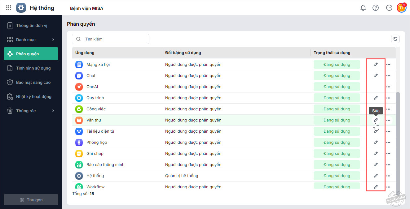 - Vào Phân quyền, nhấn đúp chuột tại ứng dụng cần phân quyền hoặc chọn vào biểu tượng Sửa tại dòng tương ứng để thực hiện phân quyền.