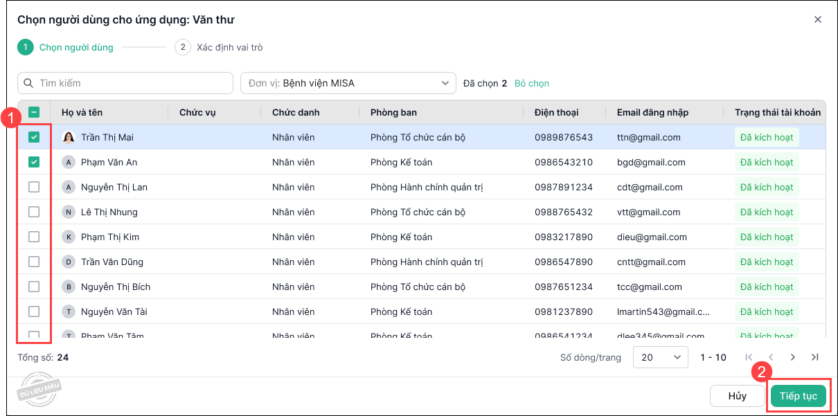 - Tích chọn người dùng cần phân quyền. Nhấn Tiếp tục.