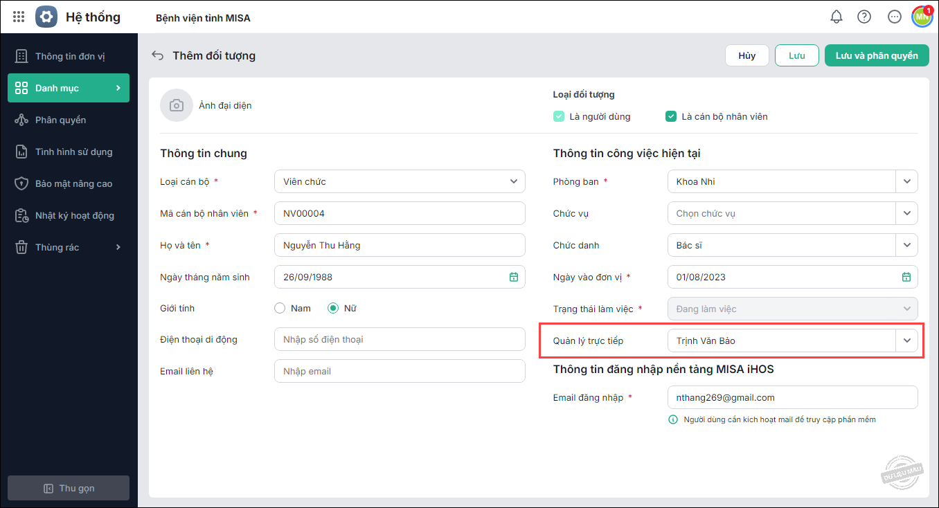 Khi quản trị hệ thống hoặc cán bộ nhân sự thêm mới hay cập nhật hồ sơ trên MISA IHOS, cần ghi nhận ai là quản lý trực tiếp của từng nhân viên. Đây là dữ liệu nền quan trọng để hệ thống xác định người nhận phê duyệt cho mọi quy trình liên quan như Quy trình, Chấm công, Tiền lương,…