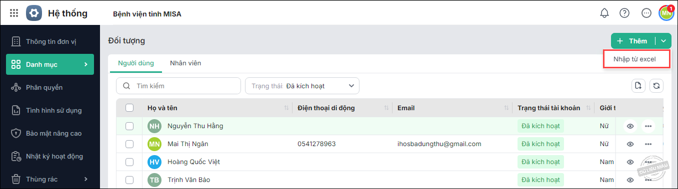 - Vào Danh mục\Đối tượng, chọn chức năng Nhập từ excel.
