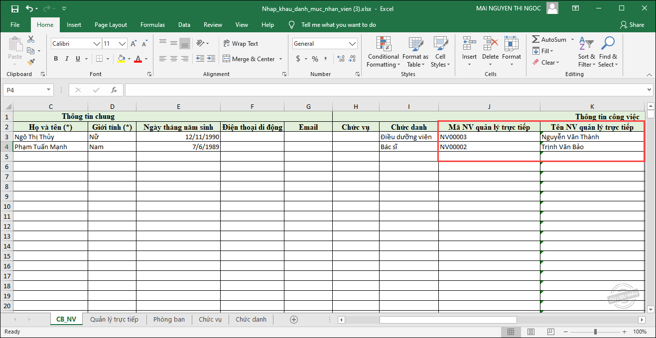 - Trên tệp mẫu nhập khẩu của chương trình, khai báo thông tin Mã NV quản lý trực tiếp, Tên NV quản lý trực tiếp.